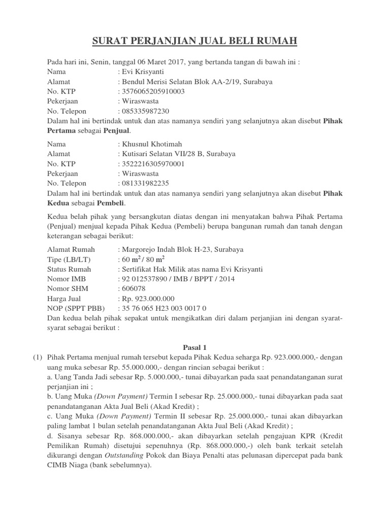 Dalam hal ini bertindak sebagai penjual berdasarkan surat perjanjian jual beli tanggal 11 mei 2014 atas sebuah rumah sebagai berikut: Tiba masa untuk tandatangan surat perjanjian. Contoh surat perjanjian pengikatan jual beli rumah sppjb ini diperlukan ketika terjadi transaksi jual beli antara 2 pihak apa bedanya dengan surat jual beli biasa. Pasal 3 uang tanda jadi 1. Kalau anda berniat membuat perjanjian dp rumah, pastikan anda telah melakukan kesepakatan bersama dengan pihak penjual rumah.